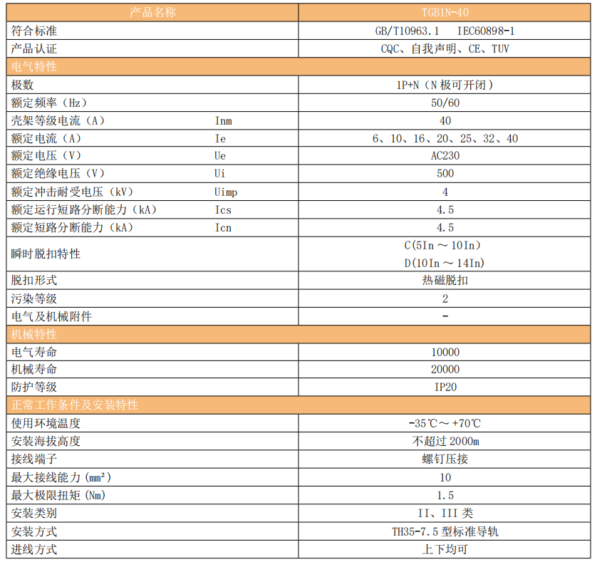 TGB1N-40 小型断路器(以下简称断路器)主要适用于交流 50/60Hz,额定工作电压 230V,额定电流至 40A 的家用及类似场所的电力线路设施和电气设备进行过载和短路保护之用,亦可用于不频繁地通断操作。尤其适用于工业和商业的照明配电系统。